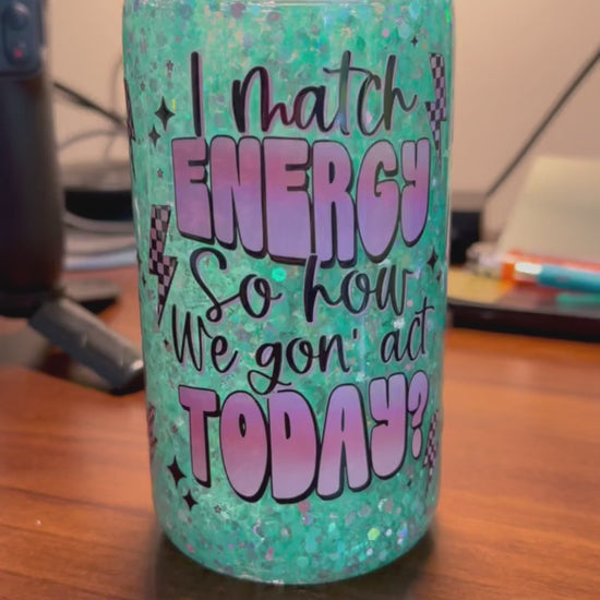 Introducing the “Energy Matcher” — a 16oz snow globe tumbler that doesn't just hold your drink, it delivers your mood. With every shake, light aqua chunky glitter swirls like a storm of sass, catching the light and turning heads. Front and center is the unapologetic mantra: "I match energy, so how we gon' act today?" — letting the world know you’re not here for anything less than real.