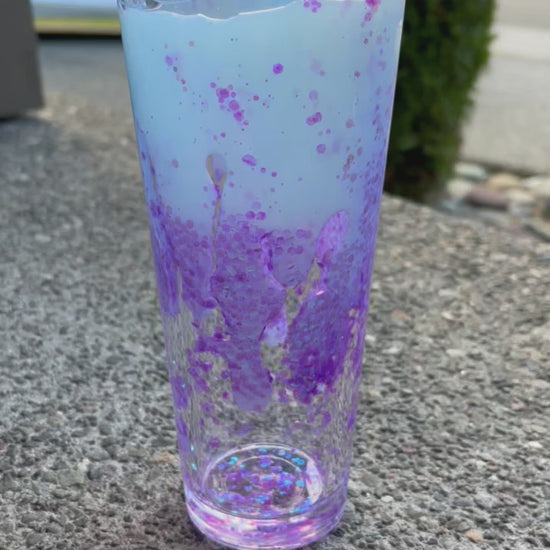 Lumora’s Lullaby is a mesmerizing relic of liquid enchantment, swirling with an ethereal glow and the tranquil hues of twilight magic. This 24oz glow-in-the-dark lava flow snowglobe tumbler radiates luminescent light blue currents, cascading through a dreamlike sea of chunky lavender glitter, as if infused with the whispers of an ancient spell.