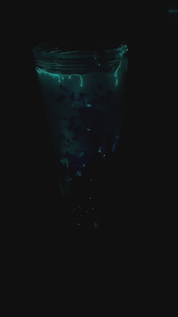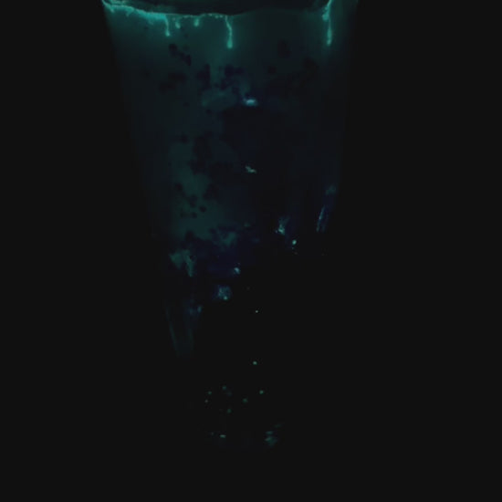 Design: Lava flow effect with light blue liquid swirls and chunky lavender glitter, glowing in the dark like stardust caught in motion.