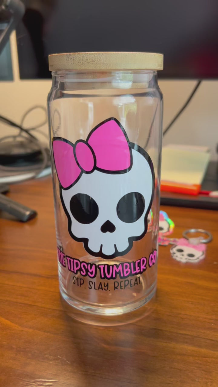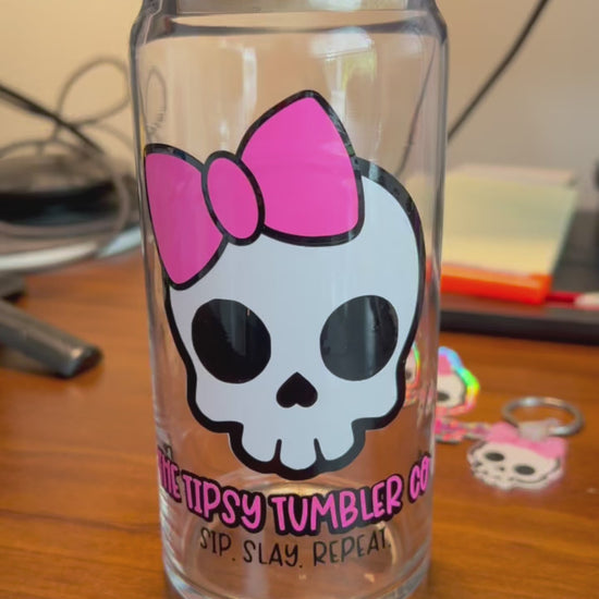 Some sip in silence. Others sip with purpose. This is for the ones who make every iced coffee feel like a power move. The CEO tumbler doesn’t whisper—it clinks with confidence. Featuring The Tipsy Tumbler Co.’s NEWEST signature skull-with-a-pink-bow logo and our no-nonsense motto “Sip. Slay. Repeat.”, this 20oz glass vessel brings big main character energy to every hydration moment.