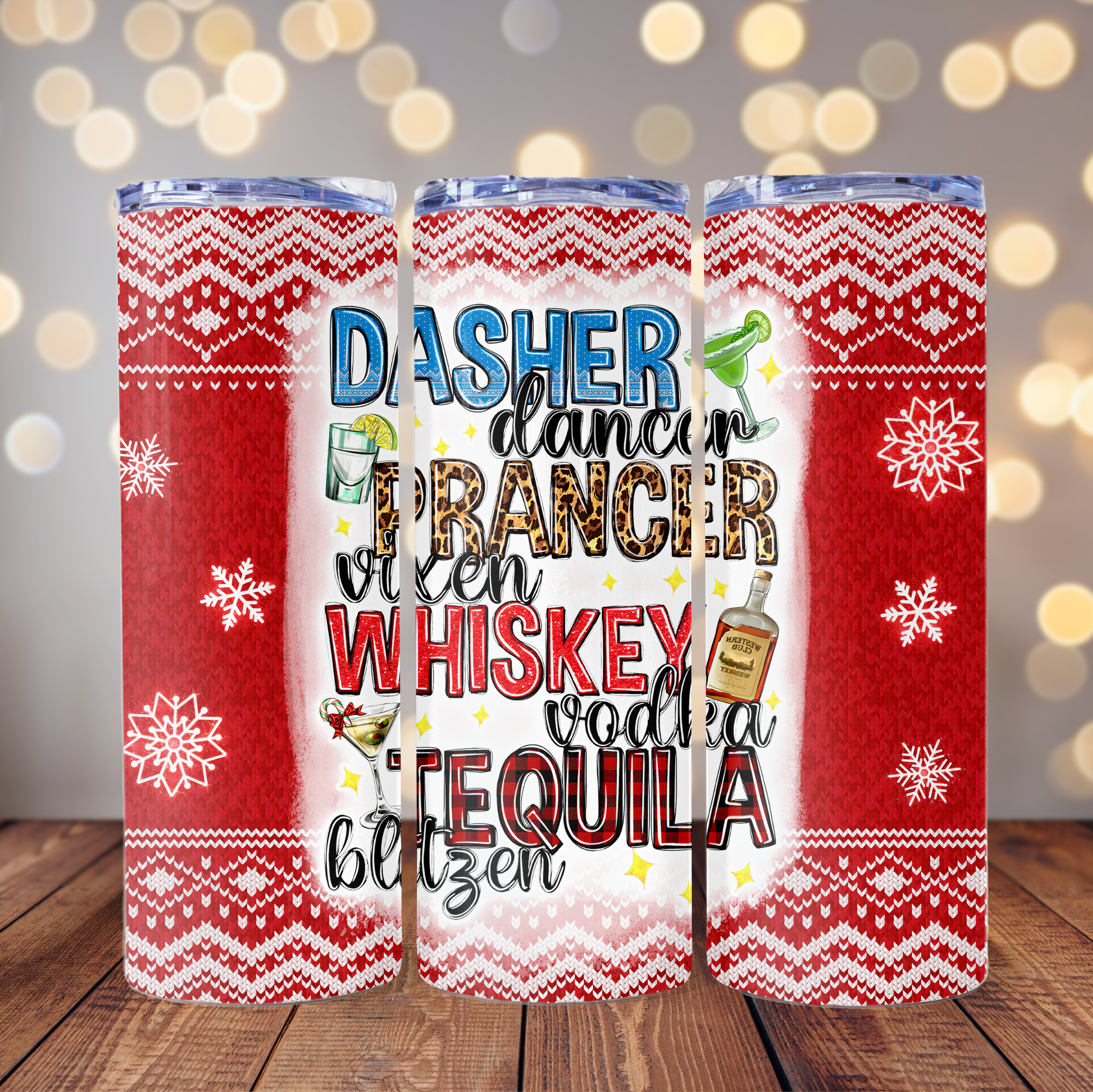 Sleigh the season with this 20oz tumbler that rewrites the reindeer roll call with a boozy wink. Featuring bold, festive text in blues, greens, leopard print, red, and buffalo plaid—this design pops against a cozy red-and-white knit Christmas sweater background. It’s equal parts merry and mischievous, perfect for holiday parties, gift swaps, or just sipping something strong while pretending to wrap presents.